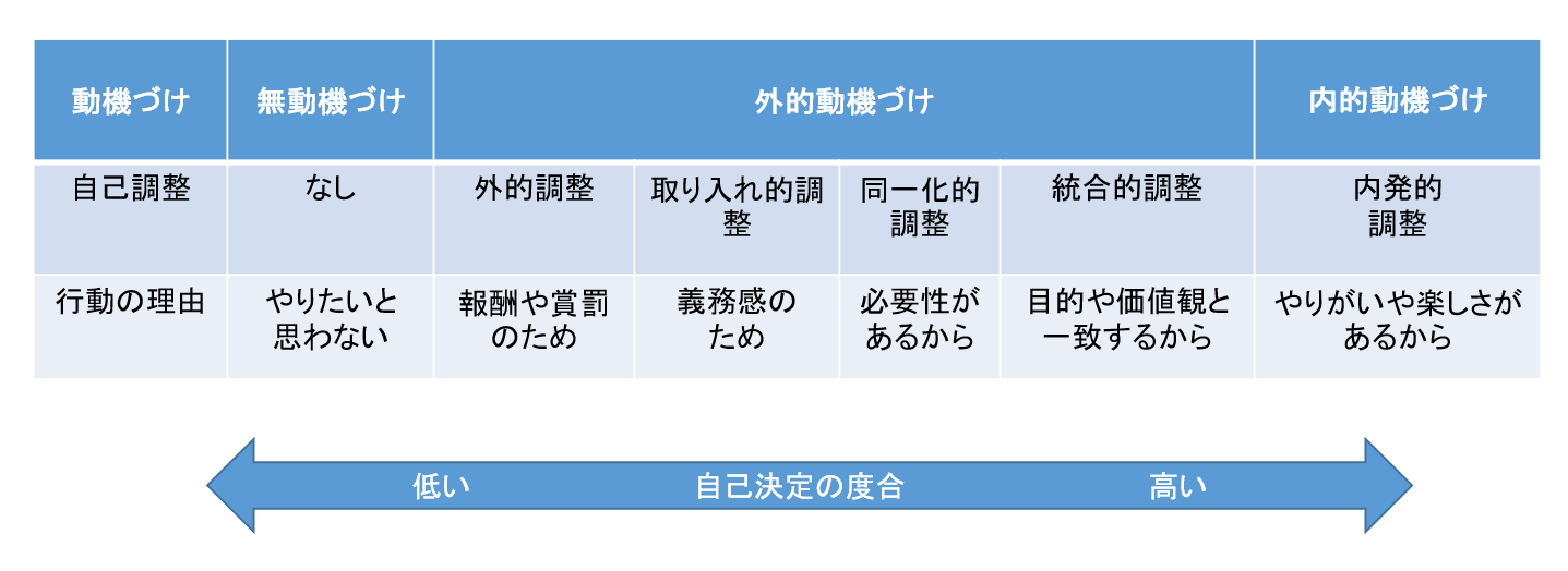 自己決定理論では外的要因は悪いもので内発的要因が正しい等の単純な構造ではなく、組み合わせによって段階が組まれていることが分かります。