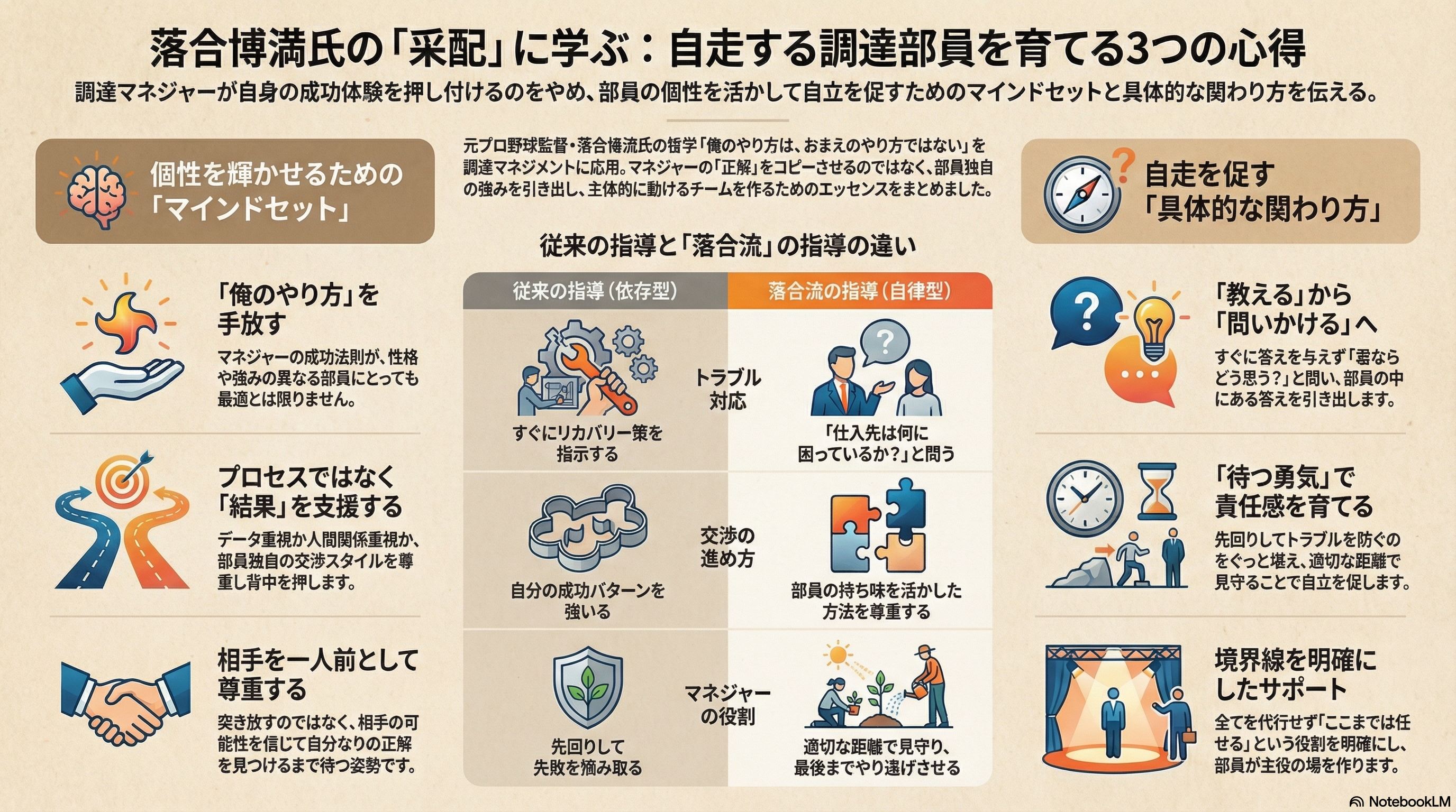 調達部員一人ひとりが自分の足で立ち、自信を持って仕事に取り組めるよう支えていくのは、調達マネジャーにとって非常にやりがいがある反面、難しさを感じる役割でもありますよね。日々熱心に指導を重ねているからこそ、「自分の伝え方が間違っているのではないか」「調達部員の個性を摘んでしまっていないか」と、ふと不安がよぎることもあるのではないでしょうか。
