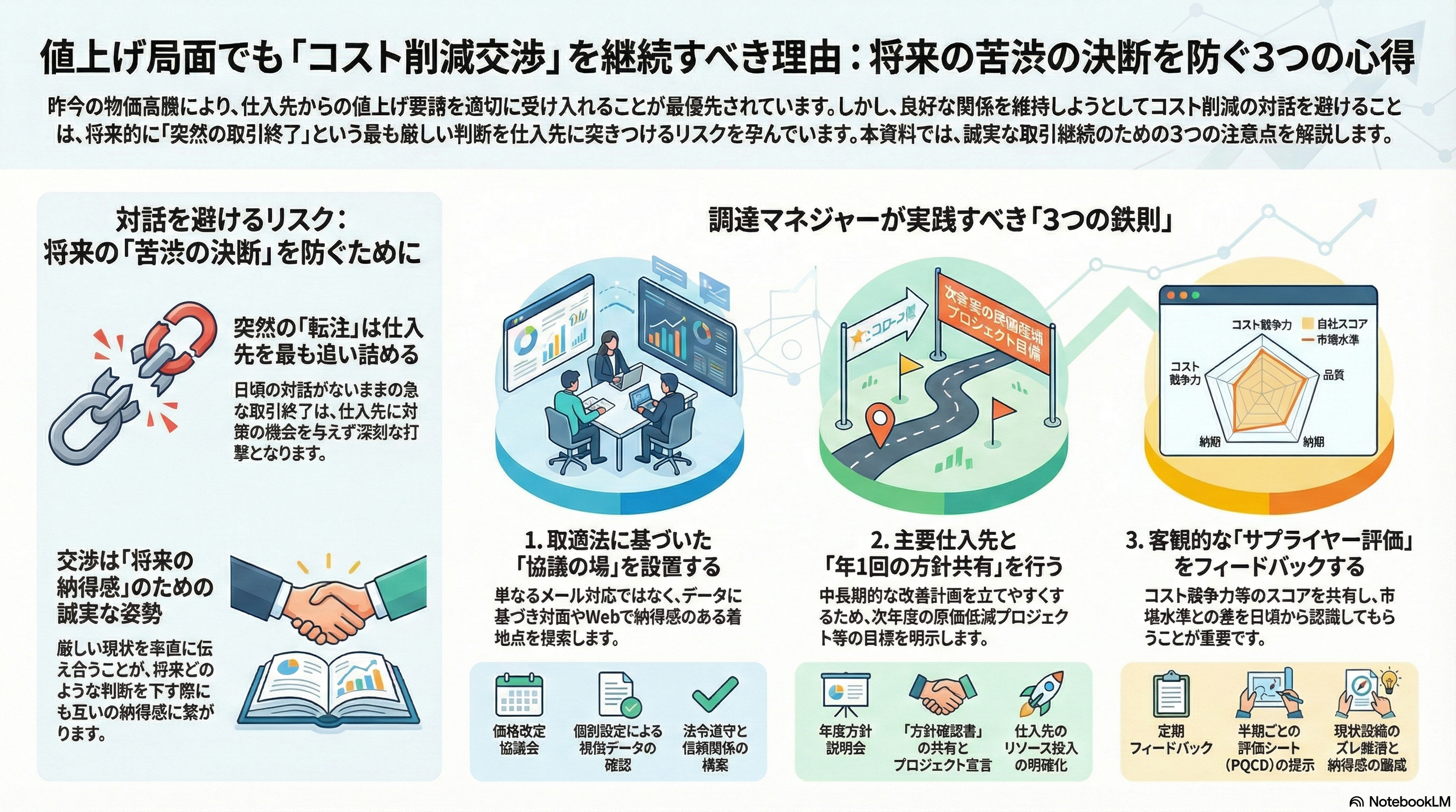 この経験から学んだのは、日頃からコスト削減交渉の場を設け、率直に現状を伝え合っておくことの大切さです。取適法を遵守し、値上げ要請を適切に受け入れることが最優先の今、コスト削減活動の話を切り出すことに慎重になってしまう調達部員もいるかもしれません。しかし、良好な関係を維持したいからといって必要な対話を避けることは、将来的に突然「転注」という厳しい判断をしなければならなくなった場合、かえって仕入先を追い詰めてしまうことにつながります。