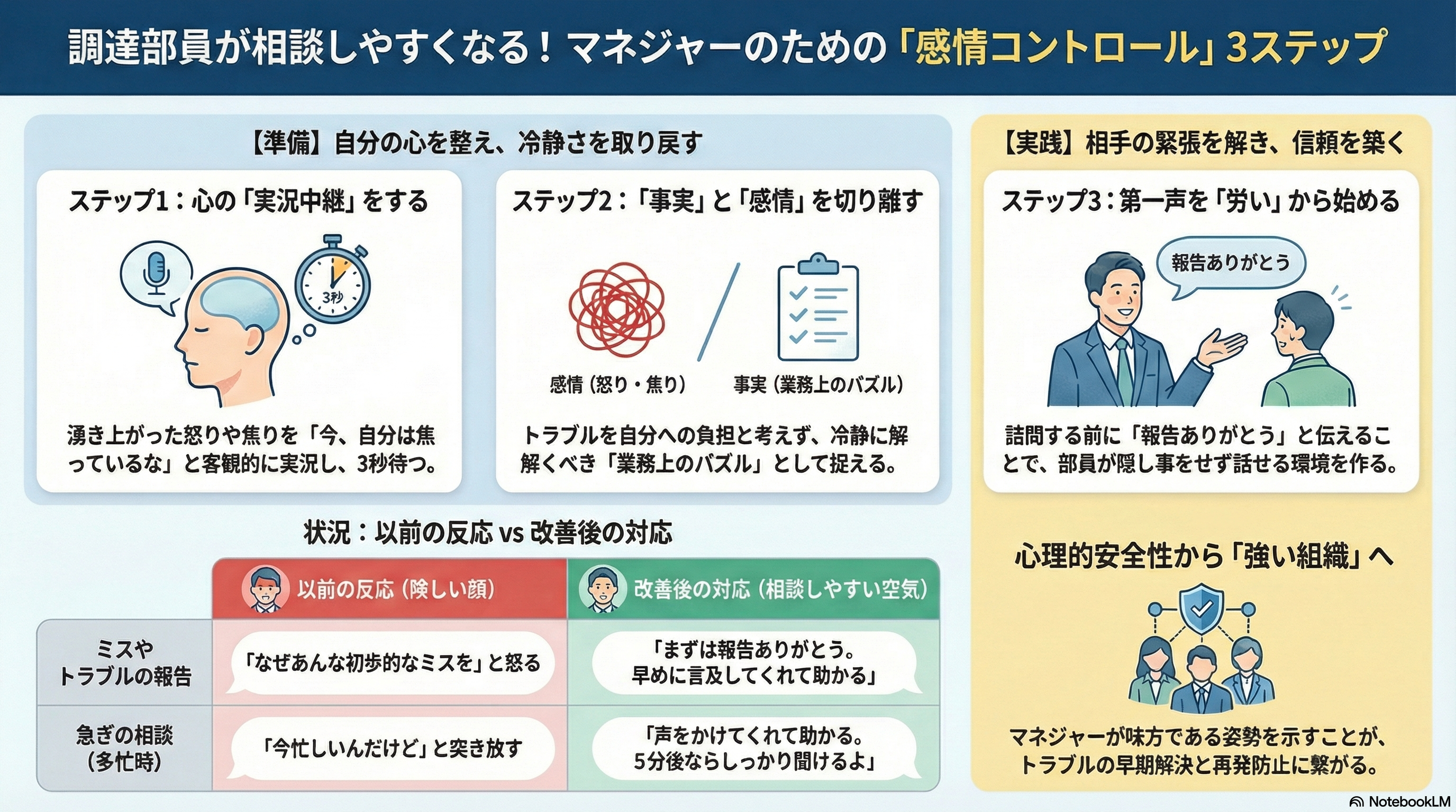 忙しさがピークの時に、調達部員からトラブルの報告が入ると、つい表情がこわばってしまったり、突き放すような言い方になってしまったりすることもありますよね。後になって「あんな態度は良くなかったな」と一人で反省し、自分を責めてしまうこともあるかもしれません。