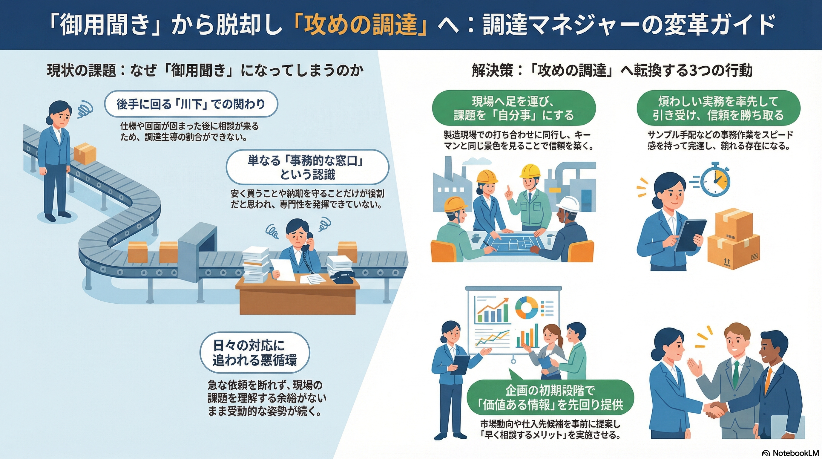 これら3つの行動に共通しているのは、受動的な姿勢を捨て、関係部署のキーマンの懐に入り込むことです。製造現場の課題を共有し、調達部門が対応する場面で信頼を得て、さらに調達の専門家としての知見を先回りして提供する。この積み重ねを調達マネジャー自ら率先して行うことが、御用聞きから脱却し、調達主導で調達業務を進めるために必要な行動になります。