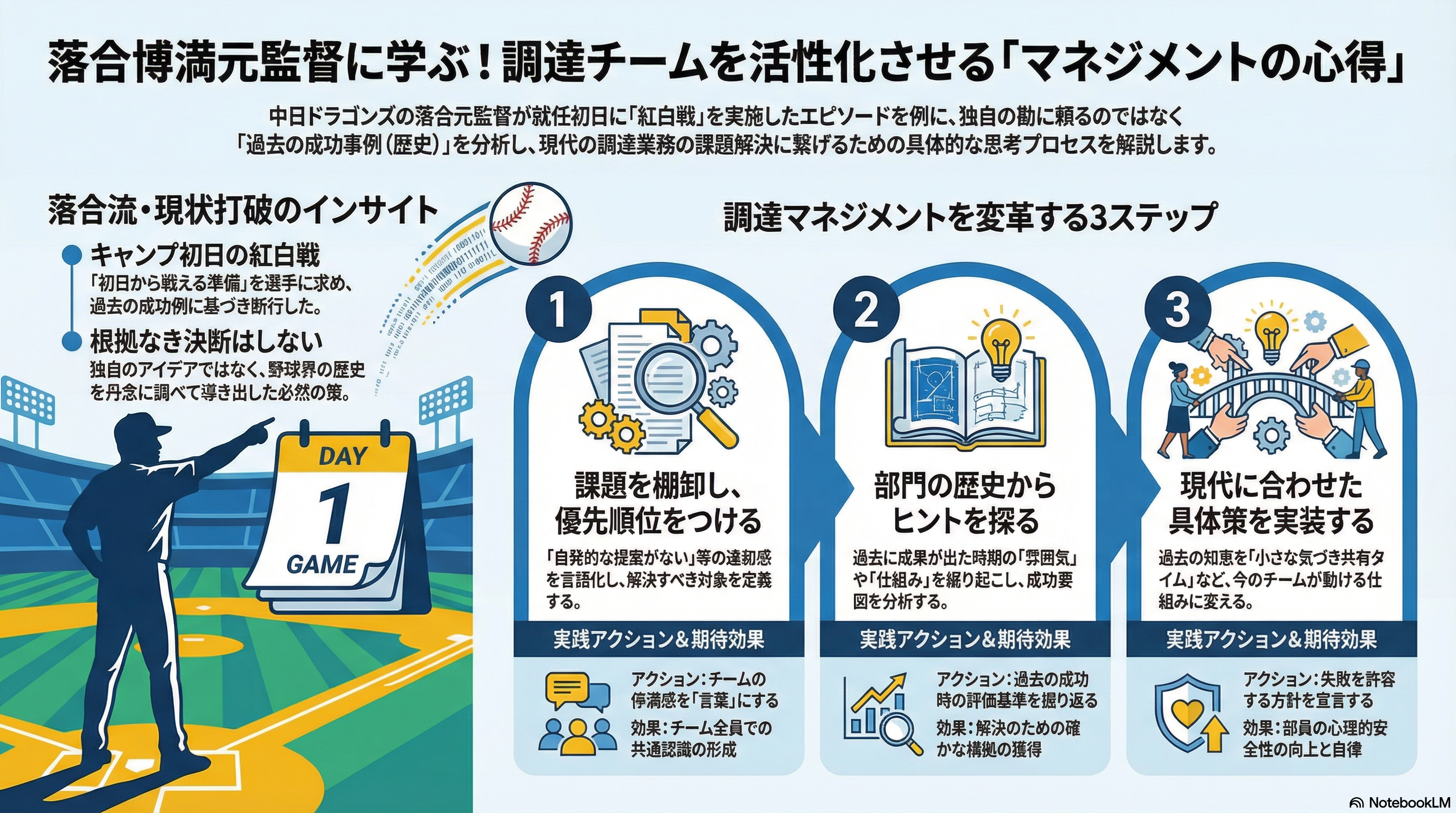 今回のブログは、かつて中日ドラゴンズを率いた落合博満元監督が、就任一年目の春季キャンプでの象徴的なエピソードをご紹介します。そこには、現在の調達チームのマネジメントにも通じる大切な考え方が含まれていますので参考にしていただければと思います。