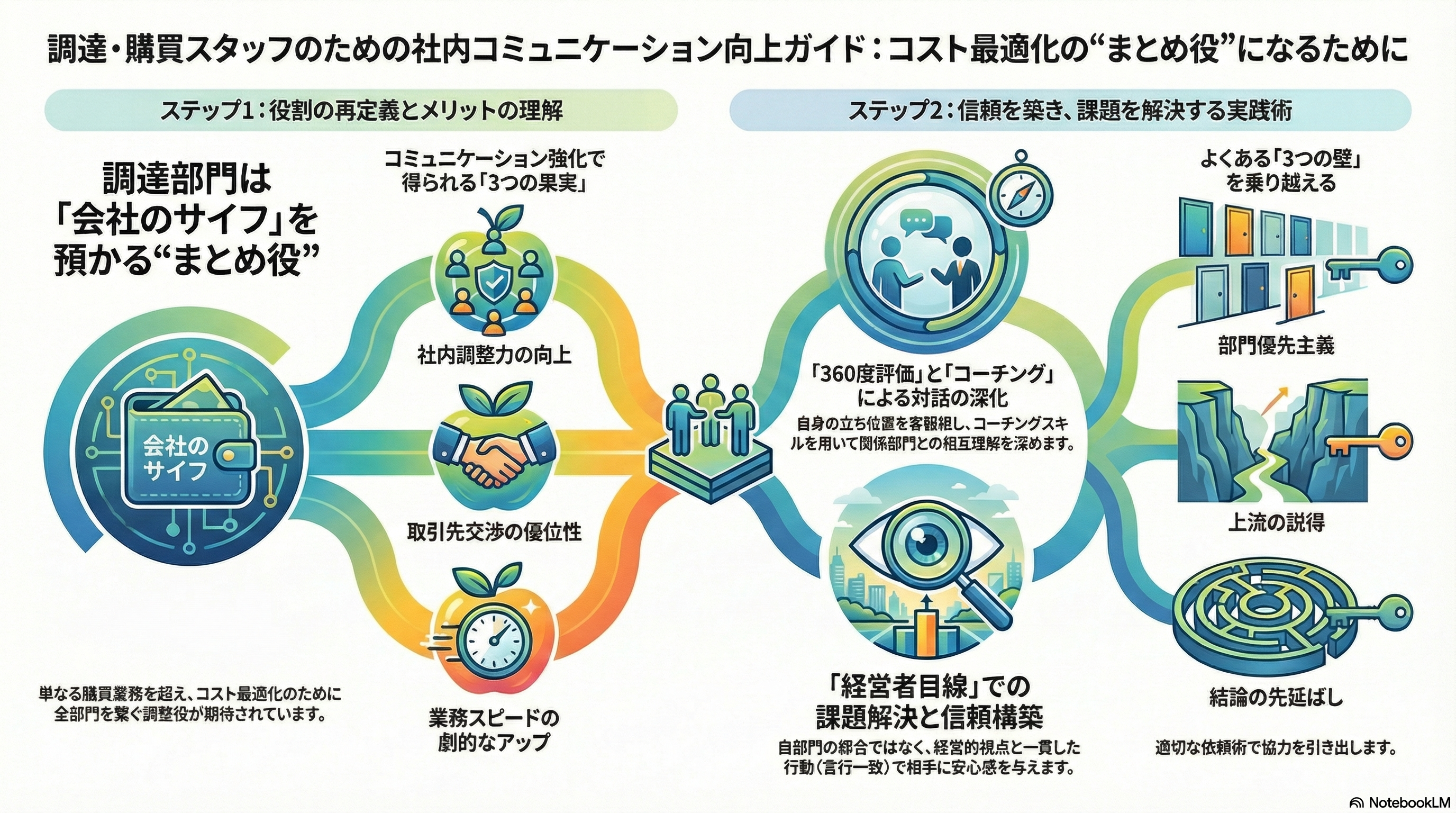 最初からすべてを完璧にこなすのは難しいものですが、まずはこの視点を持つことが、まとめ役として動くための大きな一歩になります。調達マネジャーの皆さまが、日々の調達業務のなかで「まずは関係部署の事情を確認してみよう」と優しく促すことによって、調達部員が成長するきっかけになるはずです。