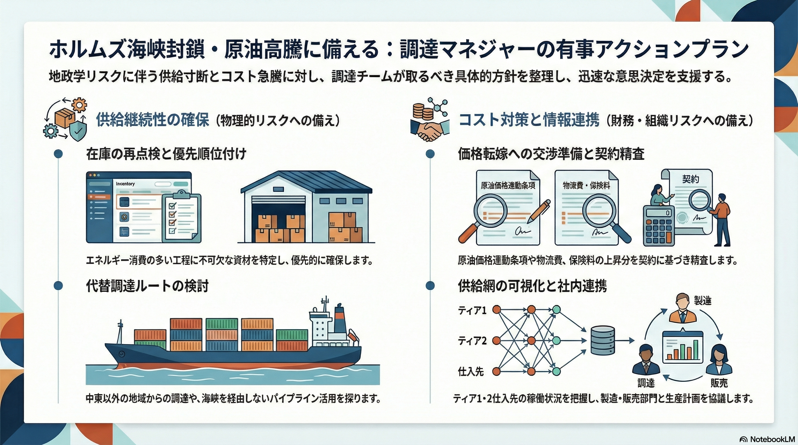 ホルムズ海峡の封鎖という厳しい局面において、調達チームを導くリーダーには迅速かつ的確な判断が求められます。ここでは、この難局を乗り越えるために調達マネジャーが取るべき調達方針についてお伝えします。